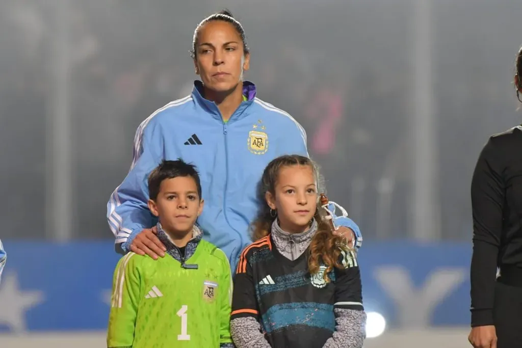 Con su rostro serio como siempre, Vanina Correa, la más grande del plantel con 39 años, ingresó al campo encabezando la fila y nada menos que acompañada de sus mellizos Luna y Romeo.