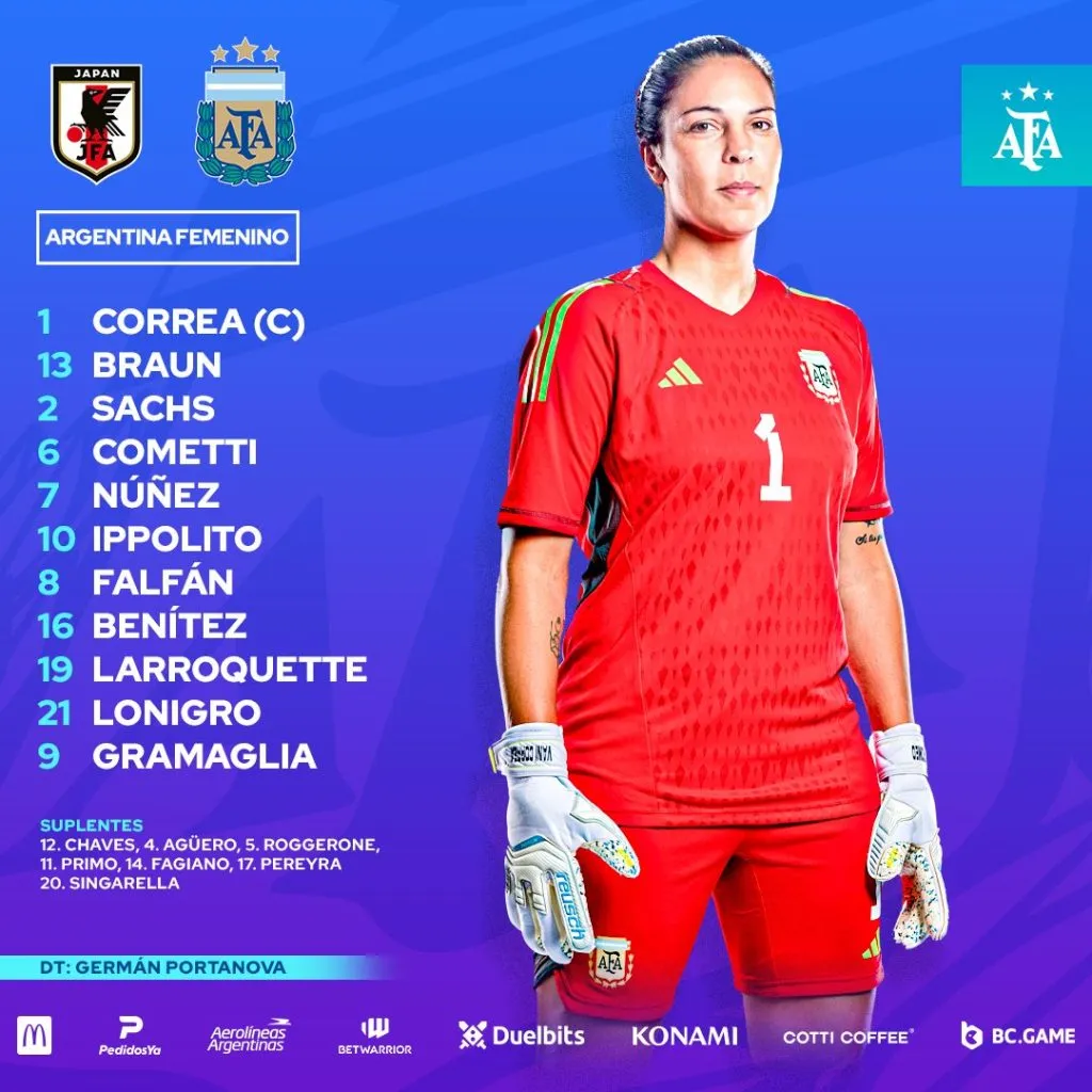 Ya en el segundo tiempo, Portanova movió el equipo, ingresaron Nerea Agüero, Chiara Singarella y Catalina Primo para intentar tener algo más el balón. Pero el equipo local recuperaba demasiado rápido y siguió probando para aumentar: a los 61 llegó el grito de Kiko Seike, definiendo casi desde el punto penal; a los 66, un pelotazo largo de Hina Sugita fue el sexto; a los 80 llegó otro penal que convirtió Riko Ueki y cerró el 8-0 a los 90 Kiko Seike por arriba de Correa. Durísimo.