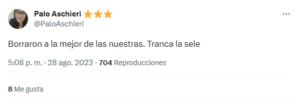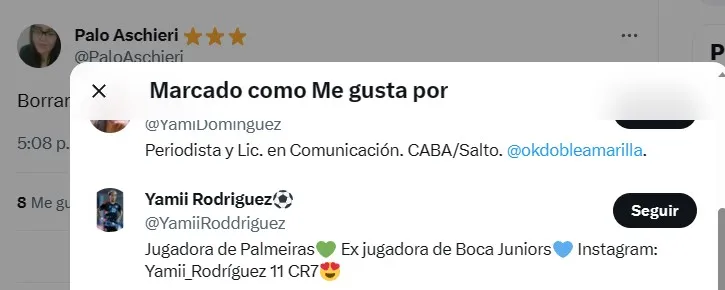 A poco de conocerse la decisión de Portanova, más de un usuario de Twitter advirtió un controversial “like” en redes sociales de la delantera de Palmeiras a raíz de un tuit de la periodista Palo Aschieri: “Borraron a la mejor de las nuestras. Tranca la sele“. Una acción que deja un mensaje para el adentro y el afuera.