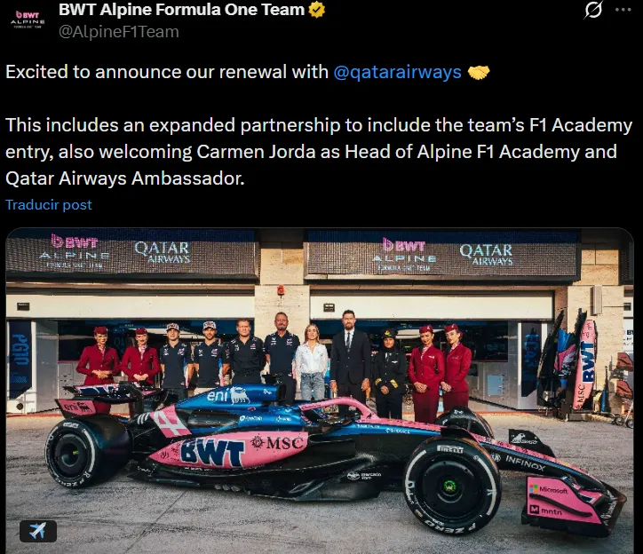 Guy Martin, director de marketing global de Alpine, manifestó: “Nos enorgullece anunciar la renovación de nuestra alianza plurianual con Qatar Airways en vísperas del Gran Premio de Qatar. Trabajar con una aerolínea global tan distinguida, cuya dedicación a la excelencia y la diversidad se alinea estrechamente con nuestros valores, es un verdadero honor. La inclusión de nuestra Academia de F1 y la bienvenida a Carmen a bordo reflejan nuestra dedicación compartida al empoderamiento”.