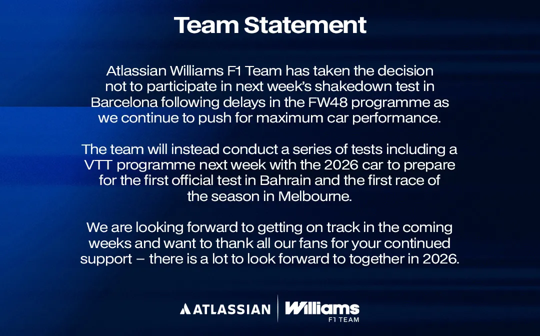 “Atlassian Williams F1 Team ha tomado la decisión de no participar de los tests de Barcelona, luego de retrasos en el programa del FW48, a la vez que continuamos empujando para sacar el máximo rendimiento del auto”, explicó la escudería. “En su lugar, el equipo conducirá una serie de pruebas, incluyendo un programa VTT [Virtual Test Track], preparando el auto para los primeros tests oficiales de Bahréin y la primera carrera de la temporada en Melbourne”, detallaron.