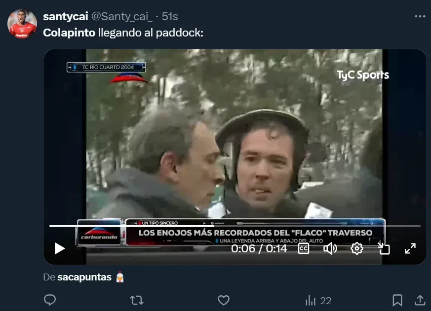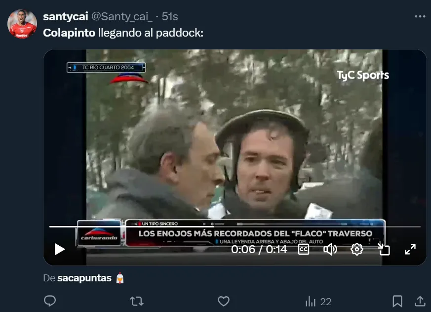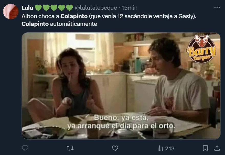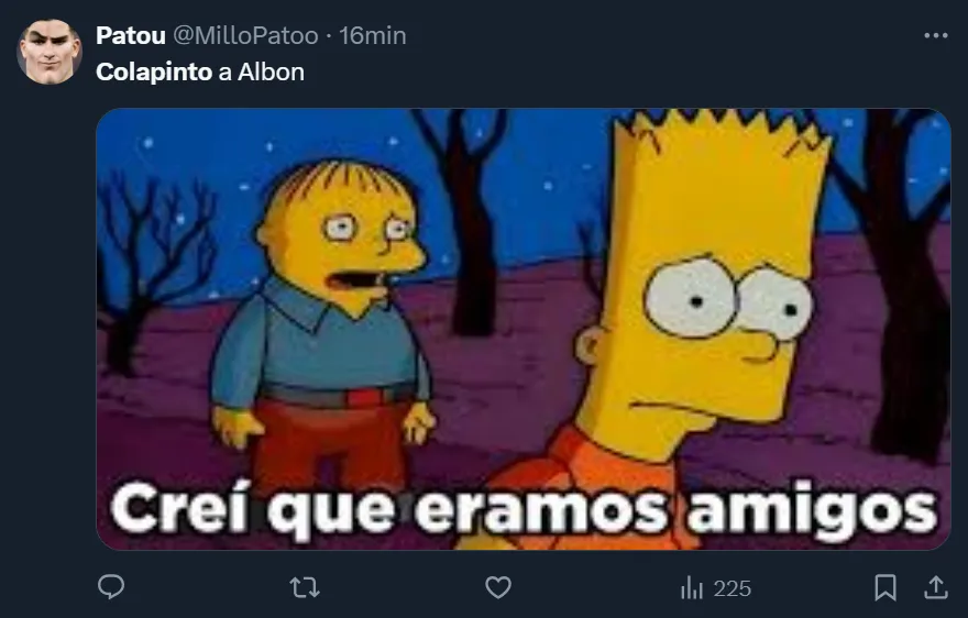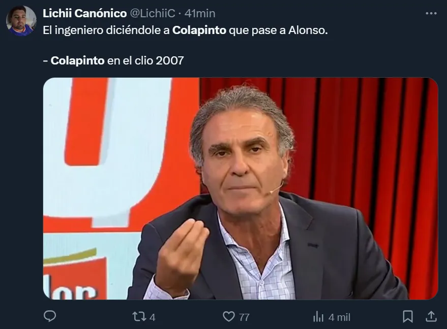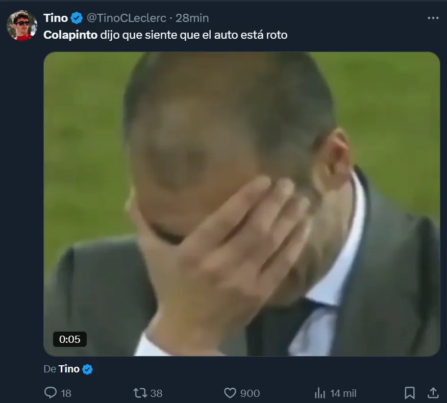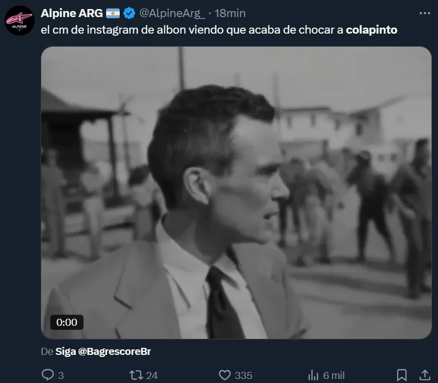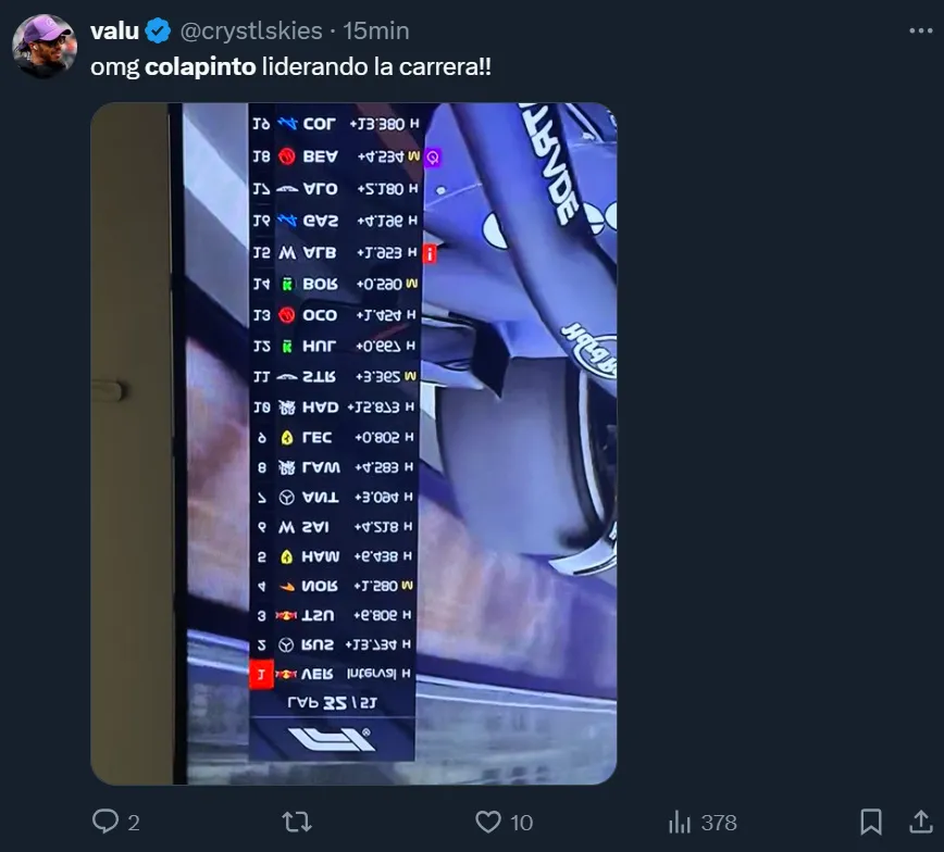 Como suele suceder en cualquier evento relevante, las redes sociales juegan su papel y los memes están a la orden del día. Muchos usuarios destacaron el gran trabajo de Franco Colapinto en las primeras vueltas, pero el foco estuvo puesto en Alex Albon y la mala maniobra que le arruinó la carrera al pilarense. Inclusive, muchos de los chistes estaban vinculados a lo que debería hacer Colapinto con su ex compañero de Williams una vez que finalice la carrera y lo comparaban con algunas actitudes de Juan María Traverso, que en más de una oportunidad fue a buscar a rivales para pelearlos.