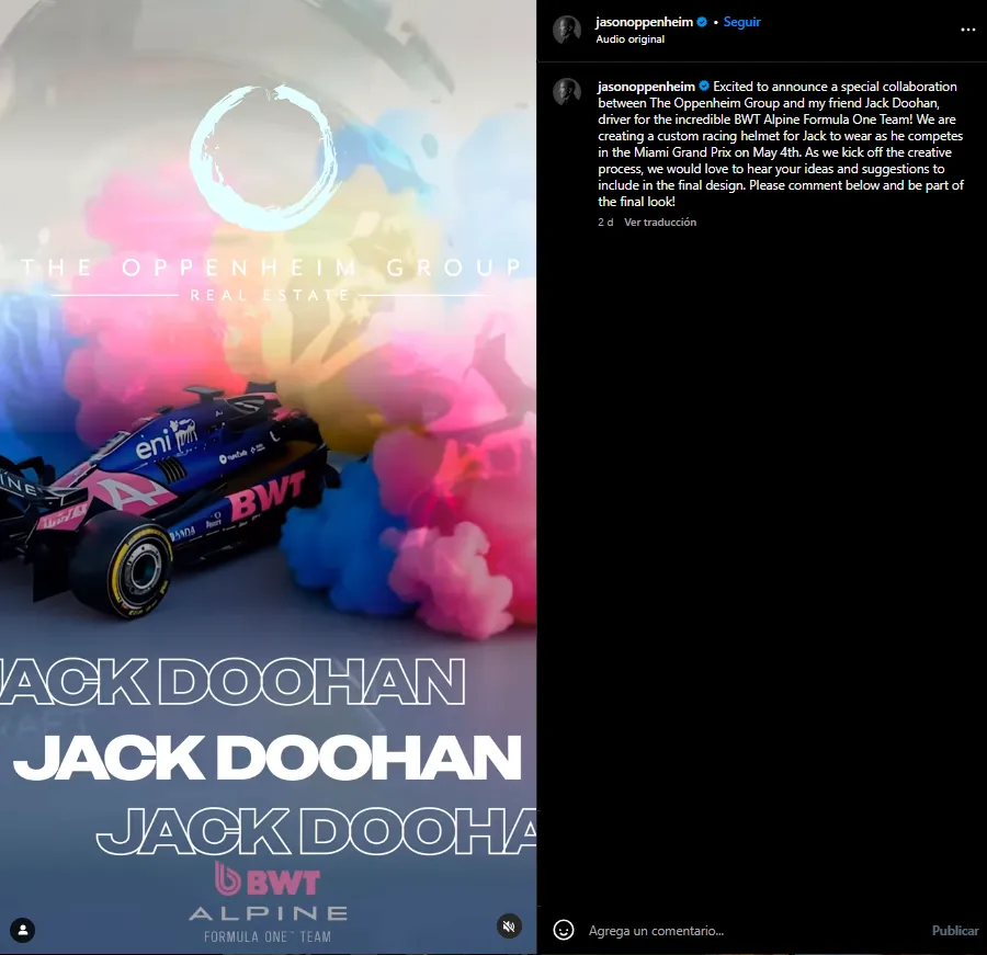 “Emocionado de anunciar una colaboración especial entre The Oppenheim Group y mi amigo Jack, piloto del increíble equipo Alpine de Fórmula 1. Estamos creando un casco de carreras personalizado para que lo use mientras compite en el Gran Premio de Miami el 4 de mayo”, comentó el presidente de la agencia.