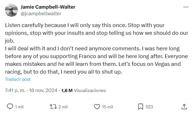 Luego de un fin de semana sin carreras pero con mucha trascendencia mediática para Franco Colapinto, Jamie Campbell-Walter, su agente, hizo un fuerte descargo en sus redes sociales. A partir de los miles de comentarios que recibieron tanto el piloto y como su entorno, el mánager británico fue tajante en su cuenta de ‘X’.