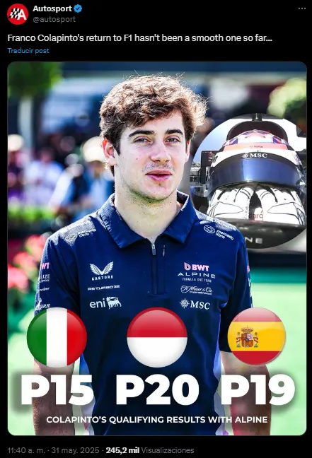 En su página web fueron más cautos, limitándose solamente a analizar su posición en la que finalizó la clasificación: “Franco Colapinto sufrió un problema en su Alpine que le impidió realizar una última vuelta, quedando 19.º en la parrilla”, señalaron. De todas formas, el posteo en sus redes sociales bastó para ganarse la reprobación de los fans del bonaerense que pilotea el A255.