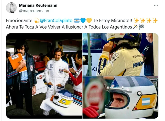 Tras las pruebas del viernes en el autódromo Hermanos Rodríguez, quien reaccionó al tributo que rindió el piloto de la escudería Williams fue precisamente la hija de Lole, que no tardó en dejarle un mensaje en las redes sociales, con pedido incluido. “Emocionante. ¡Te estoy mirando! Ahora te toca a vos volver a ilusionar a todos los argentinos”, escribió Mariana Reutemann en su cuenta de X.