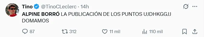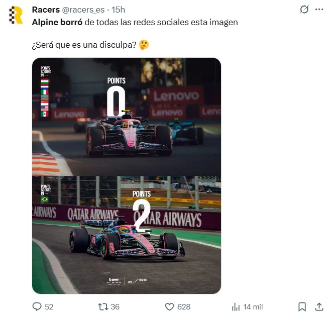 Alpine tomó la decisión de eliminar la publicación que tanta bronca generó entre los fanáticos. La gráfica con los puntos sumados por cada piloto en el último GP ya no aparece en ninguna de las redes sociales de la escudería. Una forma silenciosa de reconocer el error.