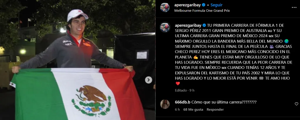 En este contexto, quien se ocupó de sembrar aún más incertidumbre sobre el futuro del piloto mexicano fue su padre, Antonio Pérez. Mediante un posteo en sus redes sociales, el progenitor de Checo señaló: “Tu primera carrera de Fórmula 1, el 2011 el Gran Premio de Australia y tu última carrera, el Gran Premio de México 2024. Su máximo orgullo la bandera más bella del mundo, siempre juntos hasta el final de la película”, comenzó en su publicación en Instagram.