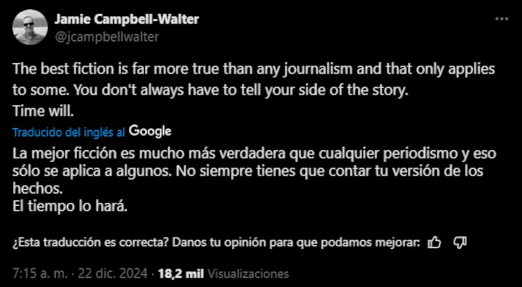 “La mejor ficción es mucho más verdadera que cualquier periodismo y eso solamente se aplica a algunos”, comenzó exteriorizando Campbell-Walter, demostrando un claro malestar y haciéndolo saber públicamente con sus palabras.