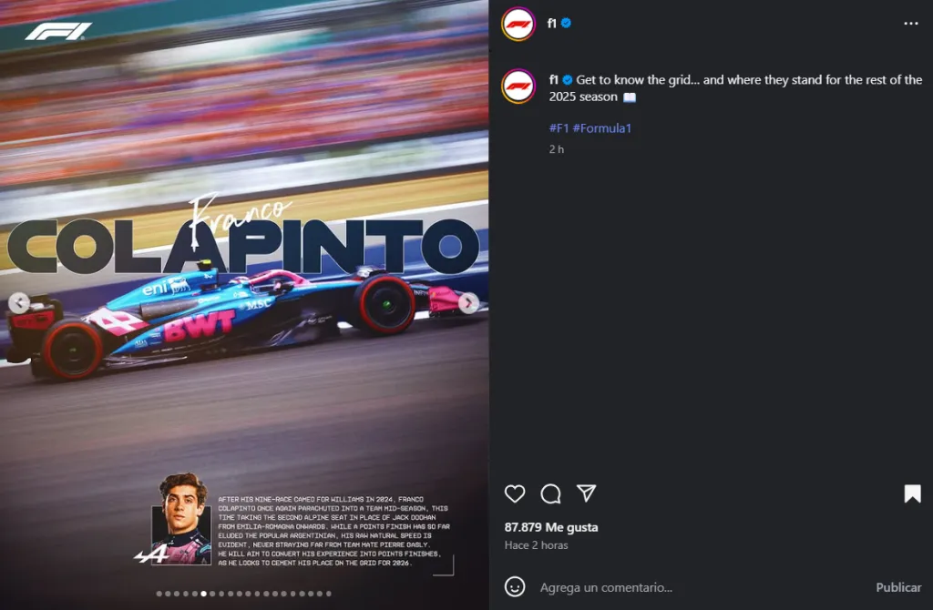 “Después de su participación de nueve carreras con Williams en 2024, Franco Colapinto volvió a incorporarse a un equipo a mitad de temporada. Esta vez tomó el segundo asiento de Alpine en lugar de Jack Doohan a partir de Emilia-Romaña. Aunque hasta ahora no ha logrado sumar puntos, el popular argentino ha demostrado una velocidad natural innata, siempre cerca de su compañero de equipo Pierre Gasly. El objetivo será transformar esa experiencia en resultados que le den puntos, mientras busca afianzarse en la parrilla de cara a 2026″, resaltaron en una publicación de Instagram donde analizaron a cada uno de los pilotos.