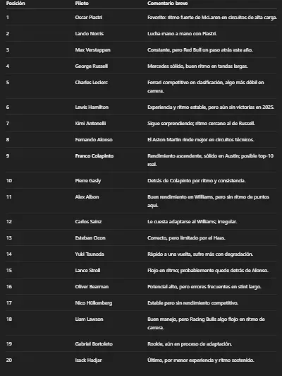 Como justificativo, la IA añadió: “En rendimiento medio, Colapinto está aproximadamente igual a Gasly pero con mejor momento reciente. En Austin, Franco tiene mayor confianza y conocimiento del circuito. Por eso, P9 para Colapinto es razonable, y con algo de fortuna (abandono de Alonso o de un Ferrari, o un safety car tardío) incluso podría escalar a P8 o P7. Gasly, en cambio, se proyecta más atrás (P10–P12) por rendimiento y contexto interno”.