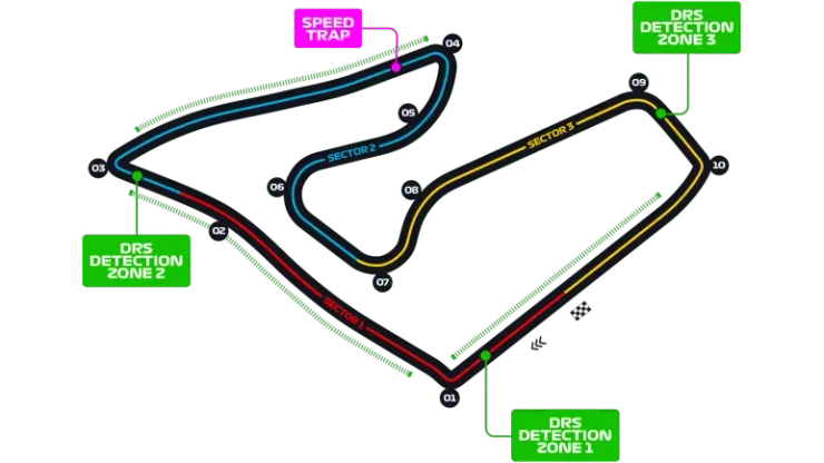 Distancia del circuito: 4,3km Curvas: 10 Longitud de carrera: 71 vueltas (306km) Horario de inicio: 10:00hs (ARG) Transmisión: Disney+, Fox Sports, F1 TV