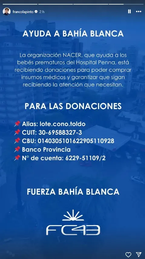 Y concluyó: “Mucha fuerza, Bahía. Entre todos los vamos a sacar adelante y vamos a reconstruir la ciudad. Estoy seguro que dentro de un tiempo vamos a poder volver a la normalidad. Sigan luchando y peleándola. Un abrazo muy fuerte”. En una historia posterior, dejó un alias para colaborar con donaciones.