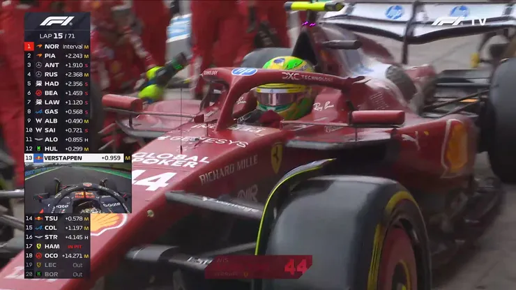 Cuando parecía que el neerlandés iba hasta el final, decide entrar a boxes y poner neumático blando. Cae al cuarto puesto, detrás de Norris y los dos Mercedes. Apenas por delante de Lawson y Piastri.