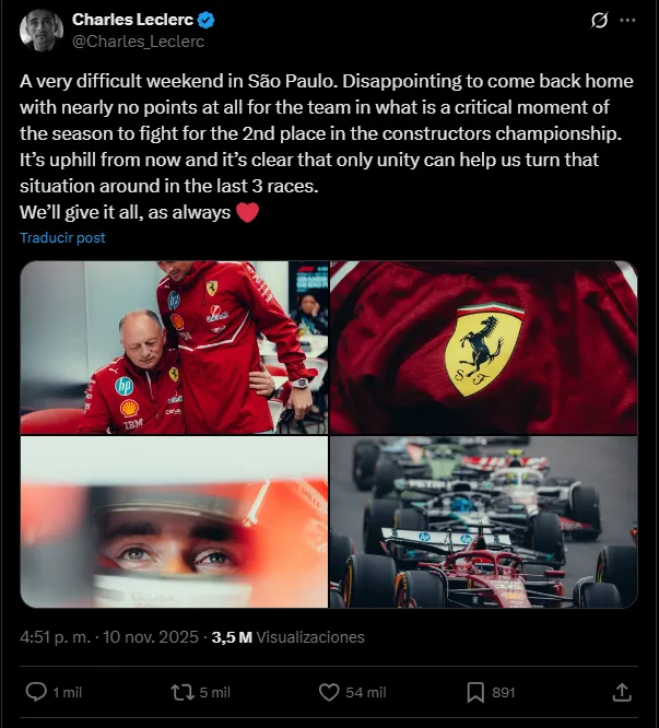 “Fin de semana difícil en San Pablo. Fue una decepción volver a casa casi sin puntos para el equipo en un momento crítico de la temporada, en la lucha por el segundo lugar en el campeonato de constructores”, inició el monegasco. Y recalcó: “Es una batalla cuesta arriba a partir de ahora, pero está claro que solo la unidad nos ayudará a dar vuelta esta situación en las últimas tres carreras. Lo daremos todo, como siempre”.