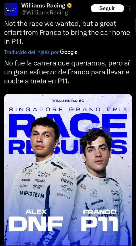 “No fue la carrera que queríamos, pero sí un gran esfuerzo de Franco para llevar el coche a meta en P11”, posteó la cuenta oficial del equipo de Colapinto, destacando su trabajo, ya que fue el mejor en esta carrera, debido a que su compañero, Alex Albon abandonó rápidamente.
