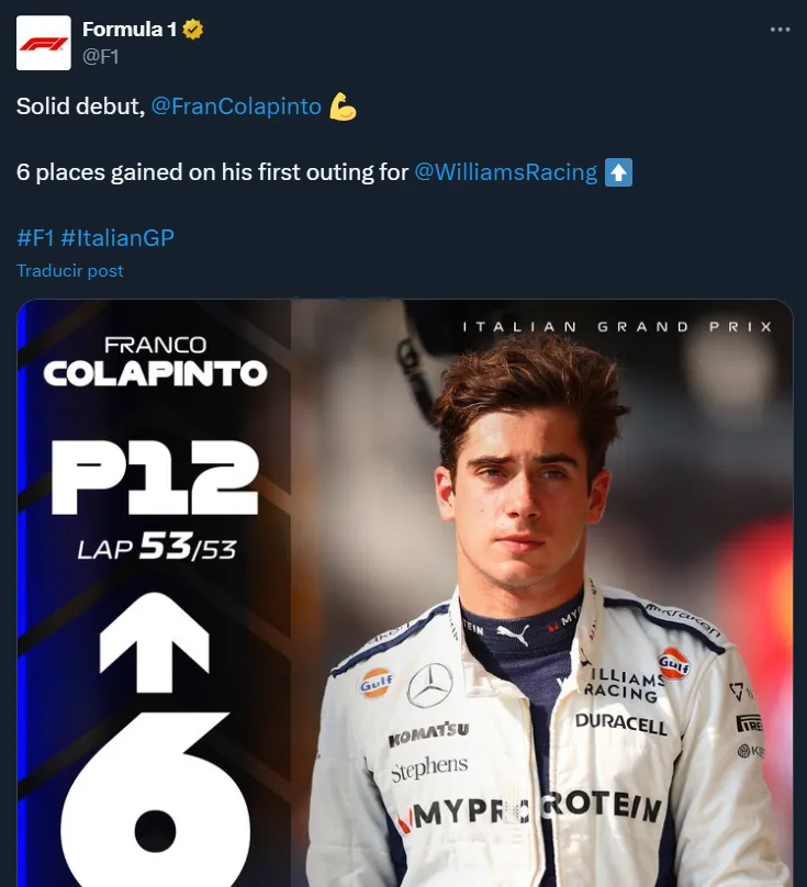 “Sólido debut, Franco Colapinto. Seis puestos ganados en su primera carrera con Williams Racing”, exteriorizó la Fórmula 1 acompañando dichas palabras con una imagen del piloto argentino en la que se destacó las colocaciones que avanzó desde la largada.
