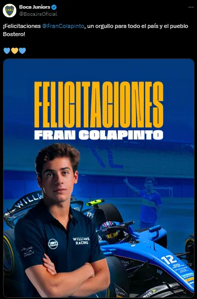 “¡Felicitaciones Franco Colapinto, un orgullo para todo el país y el pueblo Bostero!“, saludaron al piloto de Williams a través de las redes oficiales del club de La Ribera.