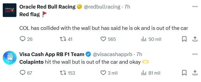 “Colapinto ha chocado contra el muro pero ha dicho que está bien y ha salido del coche“, escribió Red Bull en sus redes sociales, mientras que su escudería B publicó algo muy similar: “Colapinto chocó contra la pared pero salió del auto y se encuentra bien“.