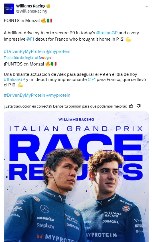 Como no podía ser de otra manera, la reacción de su escudería fue de emoción absoluta. “Debut muy impresionante en la Fórmula 1 para Franco Colapinto, que se llevó el puesto 12″, fue lo que posteó la cuenta oficial de Williams Racing a través de su perfil en X (antes Twitter).