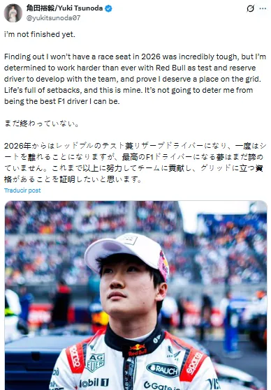 - El piloto Yuki Tsunoda publicó un sentido mensaje en sus redes tras no obtener asiento para 2026.