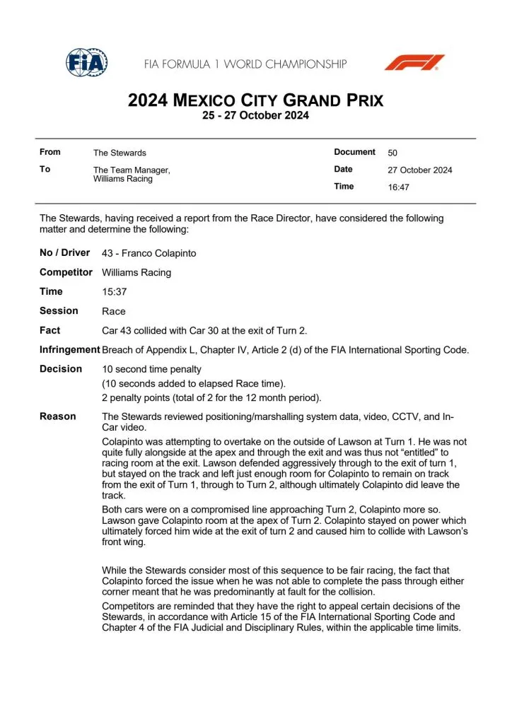 “Colapinto estaba intentando adelantar a Lawson por el exterior en la curva 1. No estaba completamente al lado en el ápice y en la salida y, por lo tanto, no tenía “derecho” a tener espacio para correr en la salida. Lawson defendió agresivamente hasta la salida de la curva 1, pero permaneció en la pista y dejó suficiente espacio para que Colapinto permaneciera en la pista desde la salida de la curva 1 hasta la curva 2, aunque finalmente Colapinto abandonó la pista”, comenzó la explicación de FIA sobre esta sanción.