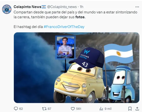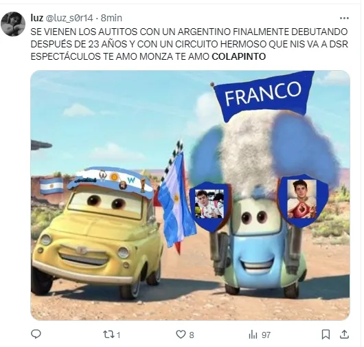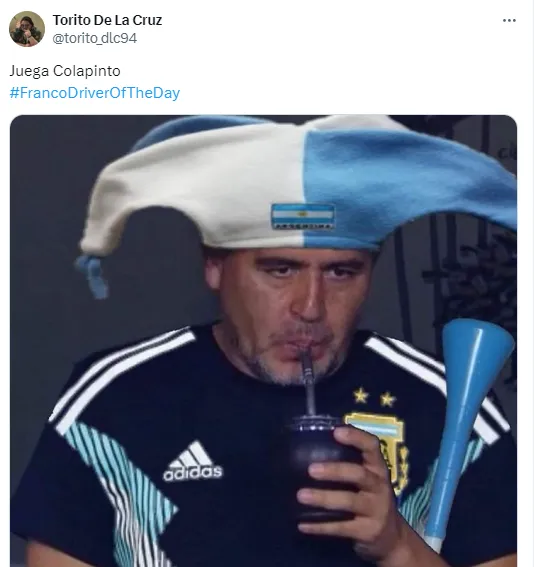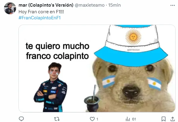 Desde la previa de esta carrera, los usuarios se mostraron muy activos en las redes sociales al vivir el minuto a minuto de la misma para apoyar al estreno del piloto de 21 años. Además, allí compartieron diversos memes sobre el desempeño del argentino.