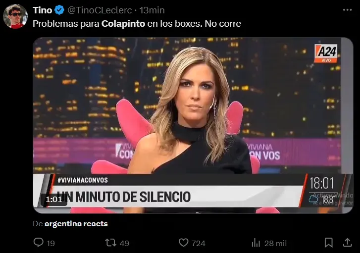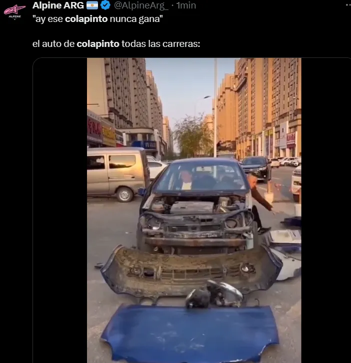 La primera reacción de Franco Colapinto fue decirle a su equipo: “Hay algo que está roto, ¿qué carajo? Dios mío, es lo mismo que en Barcelona, es lo mismo”. Esta situación se da en el marco de los rumores que Alpine estaría negociando con Bottas de cara a la próxima temporada, por lo que podría representar la salida del argentino del equipo o quedar como piloto de reserva. En las redes sociales, las repercusiones y los memes estuvieron a la orden del día.