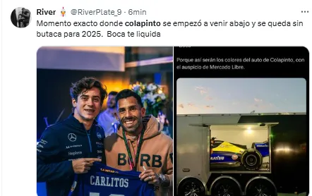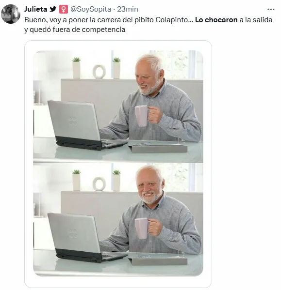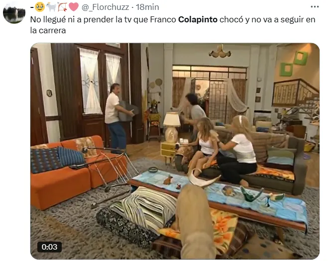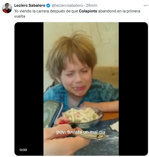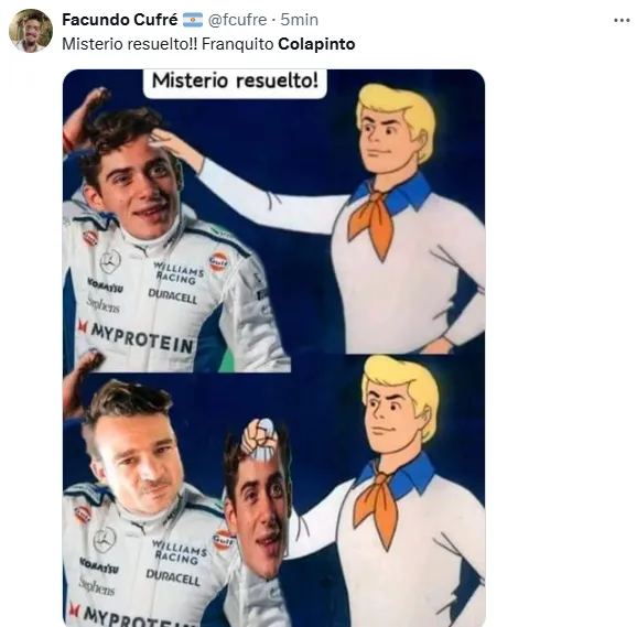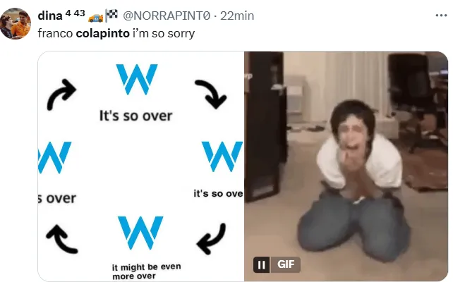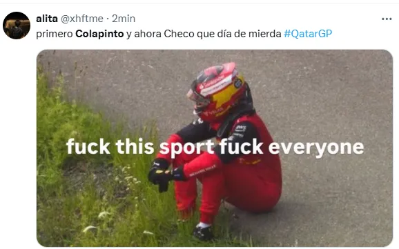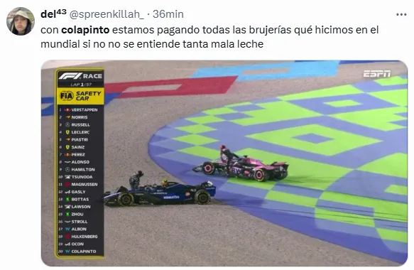 A esto, sumado a que había salido 19° y en la carrera Sprint fue 18°, se agregó este choque que no fue su responsabilidad y que involucró a los pilotos Esteban Ocon y Nico Hülkenberg. Por eso, desde las redes sociales reaccionaron con memes sobre la mala suerte del joven piloto y el dolor de sus fanáticos.