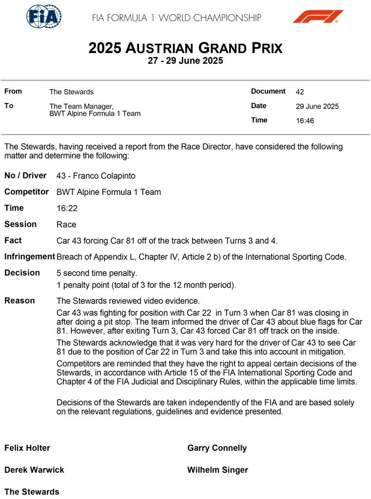 En carrera, Franco Colapinto fue penalizado con cinco segundos que se añadieron a su tiempo una vez terminada la carrera y que lo dejaron en el puesto 15 de la clasificación. Sin embargo, los comisarios fueron más allá y, apoyados en el reglamento, sancionaron a Colapinto con un punto de su superlicencia.