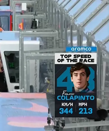 Es que, Colapinto logró la máxima velocidad de la carrera, por lo que fue el piloto que más rápido corrió por un momento. 344 kilómetros por hora levantó el argentino a bordo de su A526, para de esta manera superar al resto de los 21 participantes del GP.