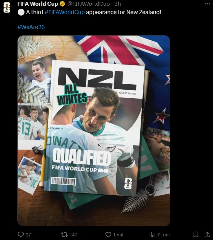 Hay un nuevo clasificado al Mundial 2026: Nueva Zelanda será el único representante de Oceanía en la Copa del Mundo. Este lunes confirmaron su clasificación al certamen más importante del mundo tras superar por 3 a 0 a Nueva Caledonia en Auckland, los autores de los tantos fueron Michael Boxall, Kosta Barbarouses y Elijah Just. El próximo martes, la Selección Argentina buscará sumarse a la lista y para eso le bastará con sumar un punto ante Brasil.