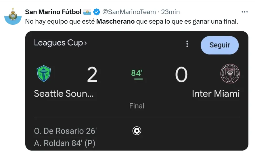 Aunque Las Garzas tuvieron varias opciones para igualar el trámite del encuentro, donde el propio astro argentino tuvo un mano a mano, no lograron ser contundentes. Luego, en los últimos minutos del cotejo, Seattle liquidó la historia de penal y de contraataque. De esta manera, se consagró campeón de la Leagues Cup e Inter Miami se quedó con el subcampeonato del certamen.