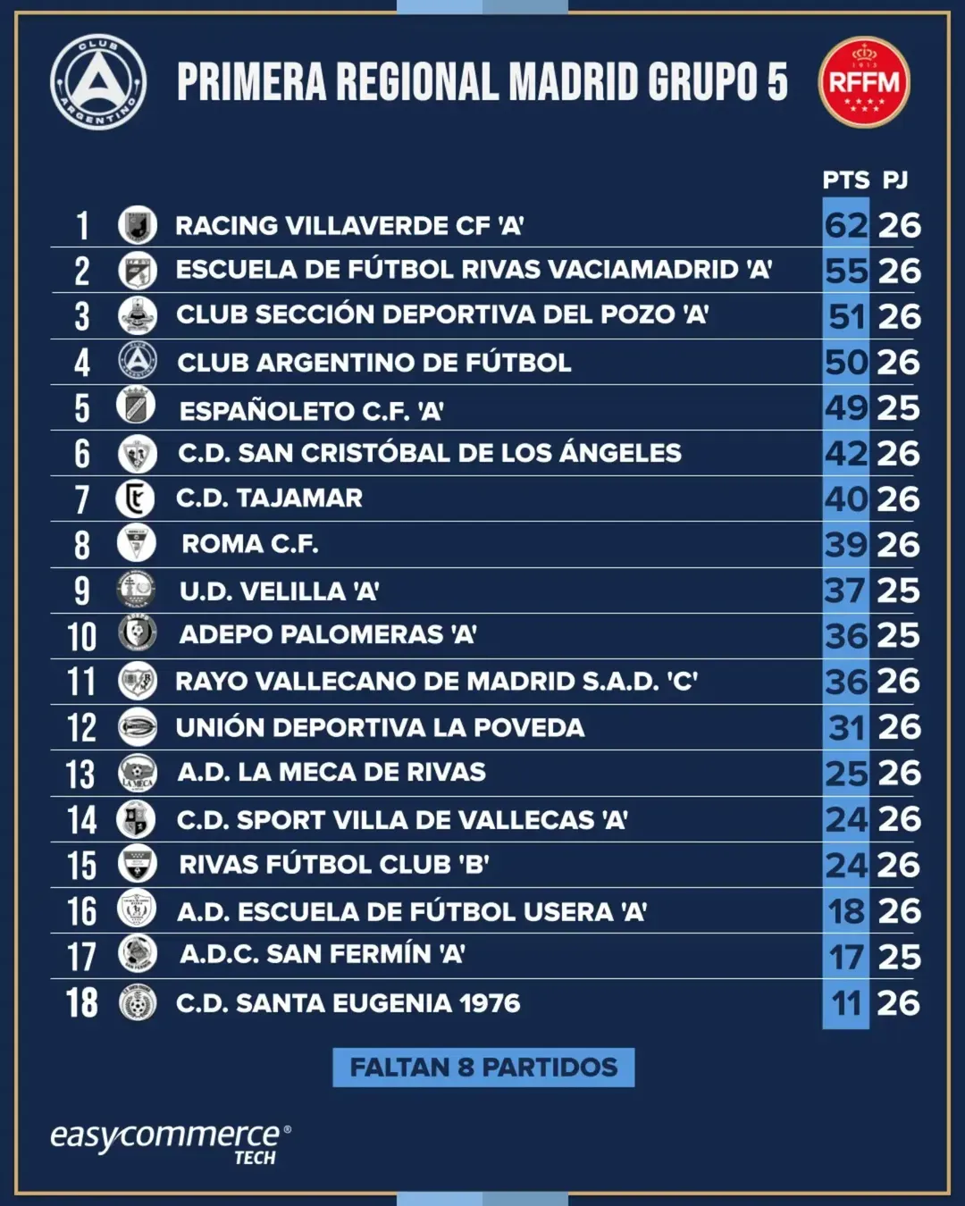 Lo positivo para la tabla fue que el segundo perdió (55 puntos) y el tercero (51) también empató, dos equipos a los que el Club Argentino (50) debe enfrentar en las últimas jornadas: quedan ocho finales. Sí ganó el puntero, Racing Villaverde, que está encaminado al título y al ascenso. Pero el objetivo del Granadero es llegar a la segunda posición que también asegura el salto de categoría, para pasar de la Primera Regional a la Preferente.