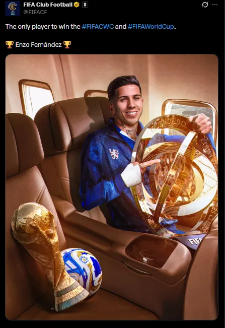 Con un posteo en sus redes sociales, desde el ente regulador de todos los clubes y selecciones del planeta, destacaron al mediocampista argentino de 25 años, que tuvo la fortuna de conquistar la cita mundialista en Qatar 2022 y también el primer certamen a nivel equipos con el mismo formato. El mismo se llevó a cabo en Estados Unidos, durante el último año, y de la mano de Enzo Maresca -era el entrenador- aplastaron a PSG.