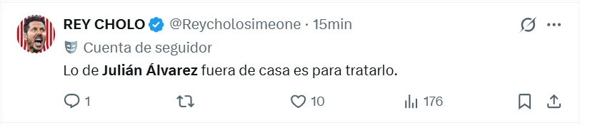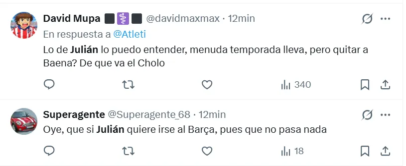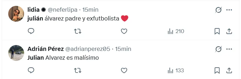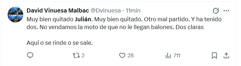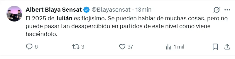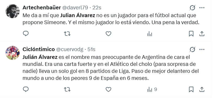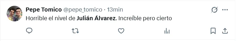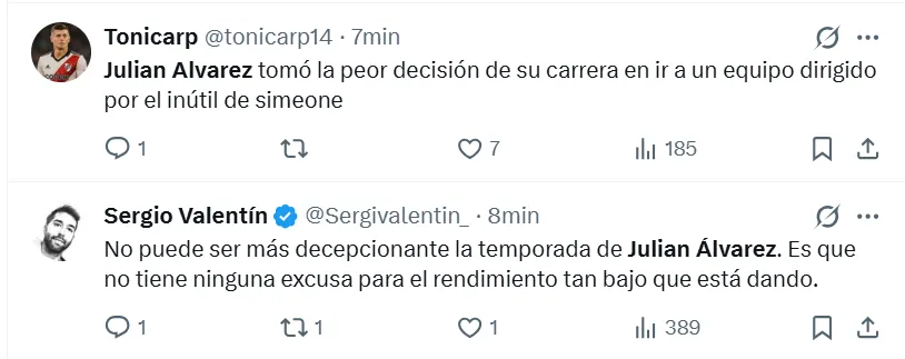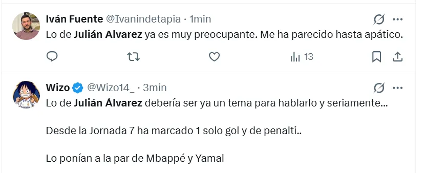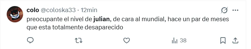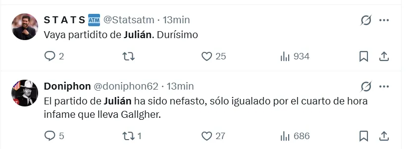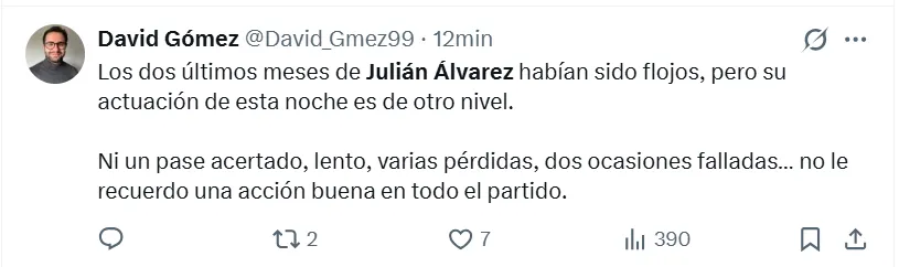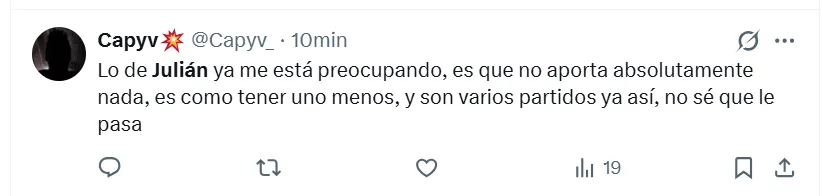 En la misma línea que lo mencionado anteriormente, otros hinchas dejaron más mensajes contra Álvarez. “Son varios partidos así“, “aquí se rinde o se sale“, “no puede pasar tan desapercibido”, “preocupante el nivel de cara al Mundial“, “horrible el nivel de Julián”, “me ha parecido hasta apático”, “no puede ser más decepcionante“, “no tiene ninguna excusa“, fueron otros destacados.