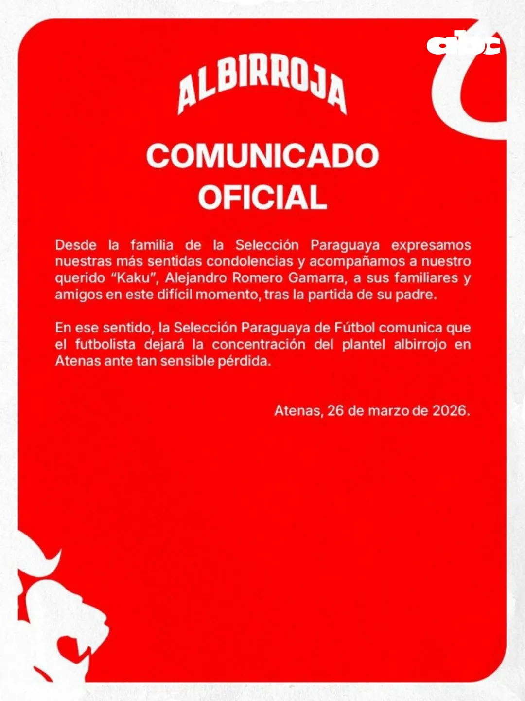 “Desde la familia de la Selección Paraguaya expresamos nuestras más sentidas condolencias y acompañamos a nuestro querido Kaku, Alejandro Romero Gamarra, a sus familiares y amigos en este difícil momento, tras la partida de su padre”, se expresó desde la Albirroja.