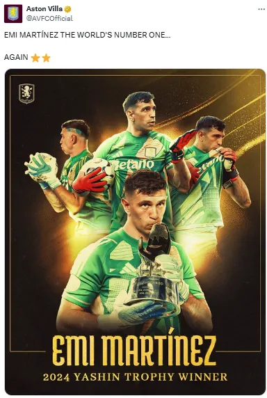 A través de su cuenta oficial de Instagram, Aston Villa reconoció a su arquero con dos publicaciones. “Emi Martínez es el número uno… Otra vez”, compartieron primero con una placa del argentino.