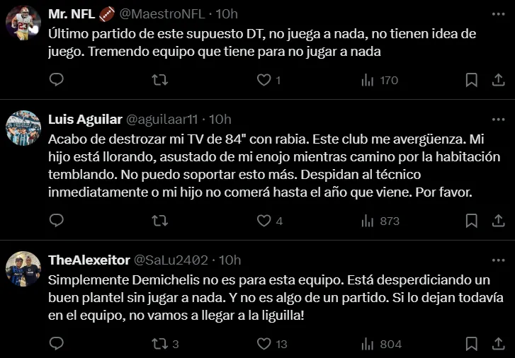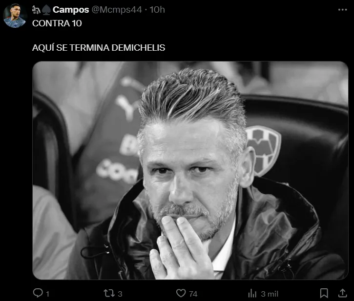 En esta oportunidad, Rayados igualó 1 a 1 contra Cruz Azul en condición de visitante, pero un detalle que no pasó para nada inadvertido fue que la Máquina Cementera jugó más de quince minutos con uno menos por la expulsión de Gonzalo Piovi. En las redes sociales, los cuestionamientos para Martín Demichelis fueron casi unánimes. Cuando Rayados publicó en su cuenta de X la placa con el resultado final del partido, los comentarios fueron en su inmensa mayoría en contra del ex entrenador de River.
