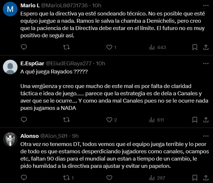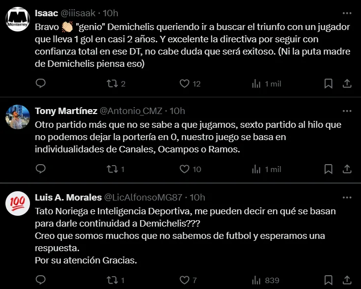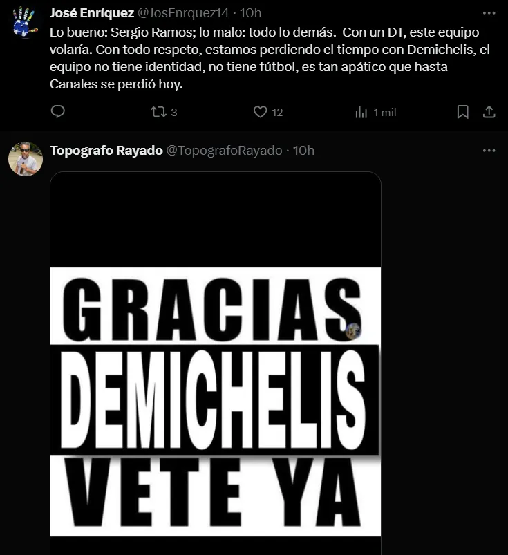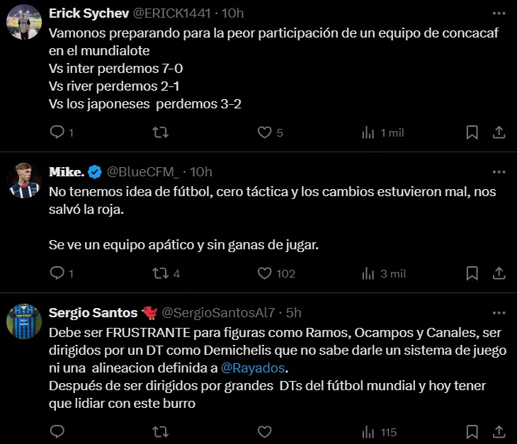 Muchos pidieron su salida, otros utilizaron el humor con algunos memes, pero lo que está claro es que los hinchas perdieron la paciencia con Martín Demichelis. En la misma línea solamente hubo elogios para Sergio Ramos -autor del único tanto de Rayados ante Cruz Azul- pero siguen las críticas sobre todo para los mediocampistas creativos y para los delanteros, especialmente para Germán Berterame.