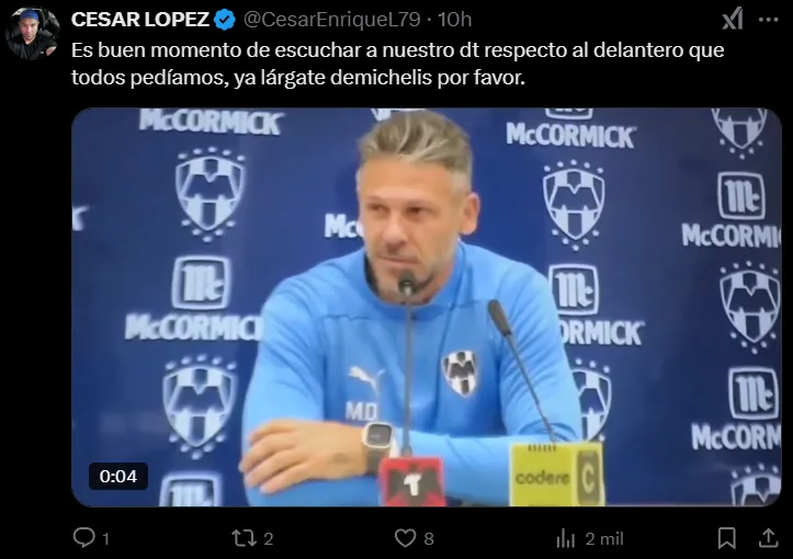 Cabe destacar que el elenco de Monterrey están en la posición número 12 del torneo con 6 unidades producto de un triunfo, tres empates y dos caídas. Ante esta situación, comienza a tambalear Martín Demichelis como entrenador. Al menos, son varios los hinchas que piden su renuncia en las redes sociales.