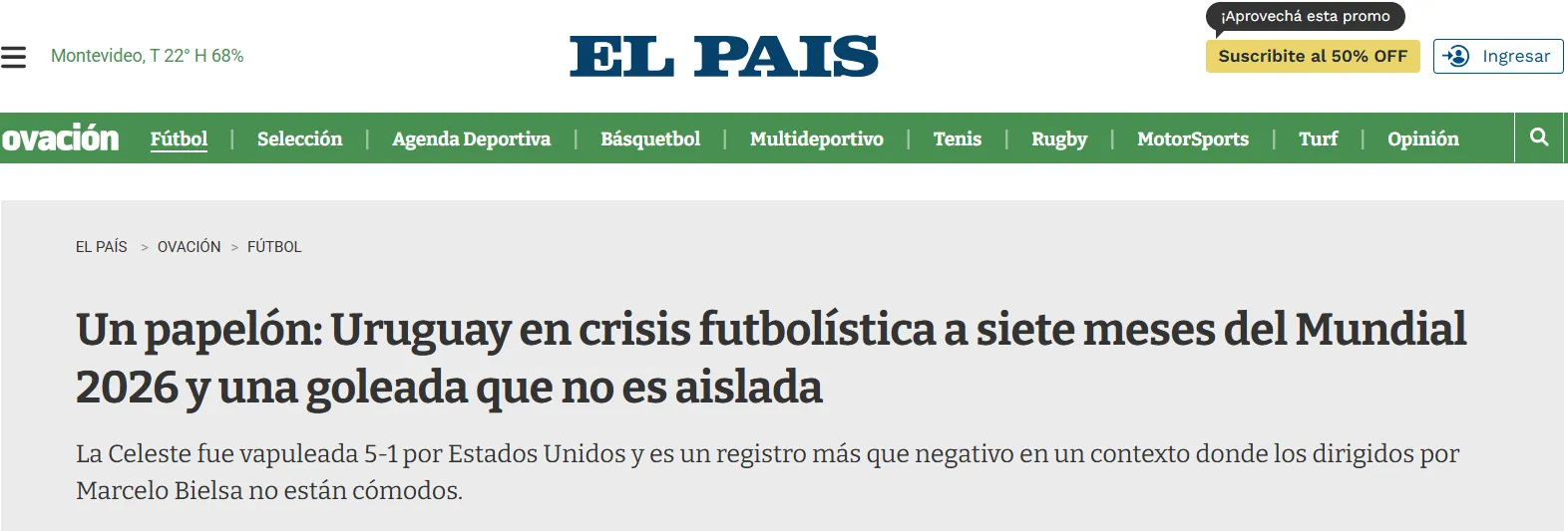 El mismo medio, publicó más tarde: ”Un papelón: Uruguay en crisis futbolística a siete meses del Mundial 2026 y una goleada que no es aislada. La Celeste fue vapuleada 5-1 por Estados Unidos y es un registro más que negativo en un contexto donde los dirigidos por Marcelo Bielsa no están cómodos”.