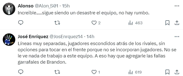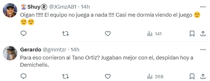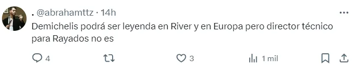 Otro aspecto que no gusta del entrenador es su manera de declarar, algo similar a lo que ocurría en su etapa en River. La falta de autocrítica, los mensajes poco claros y que lo que dice no se ve plasmado en la cancha. Esos son los aspectos más se le cuestionan a Martín Demichelis. Pero el DT no es el único castigado en las redes sociales, también los cañones apuntan al presidente, José Antonio Noriega, y su director deportivo, Héctor Lara. Pese a que parece apresurado, el resultado del clásico ante Tigres de la próxima jornada podría ser clave para el futuro del entrenador argentino.