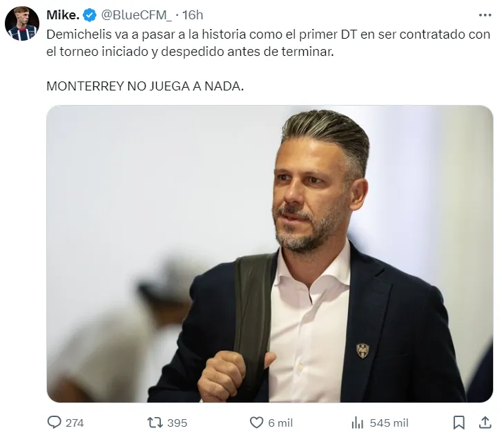 El 13 de agosto de 2024, tan solo dos semanas después de dejar su puesto en River, Martín Demichelis fue oficializado como entrenador de Rayados de Monterrey, uno de los clubes más fuertes del fútbol mexicano. Con apenas siete partidos dirigidos, la paciencia de los hinchas comenzó a terminarse ya que el equipo todavía no mostró una buena versión, pese a que se encuentren en el cuarto puesto en la tabla de posiciones.