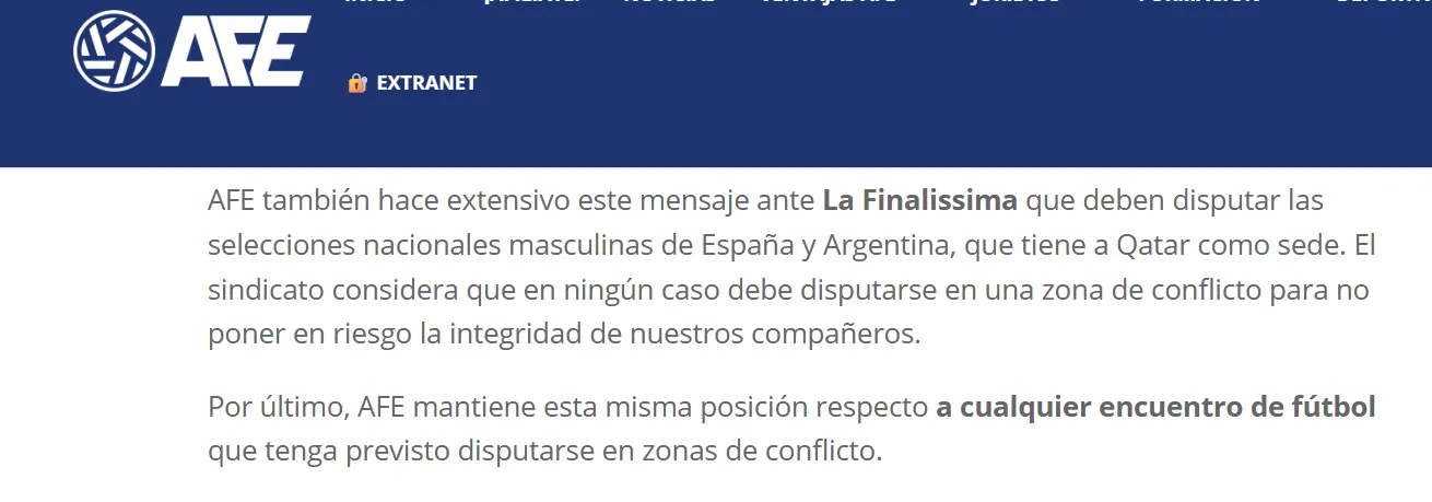“AFE también hace extensivo este mensaje ante La Finalissima que deben disputar las selecciones nacionales masculinas de España y Argentina, que tiene a Qatar como sede”, inició la entidad, para luego remarcar que “en ningún caso debe disputarse en una zona de conflicto para no poner en riesgo la integridad de nuestros compañeros“.