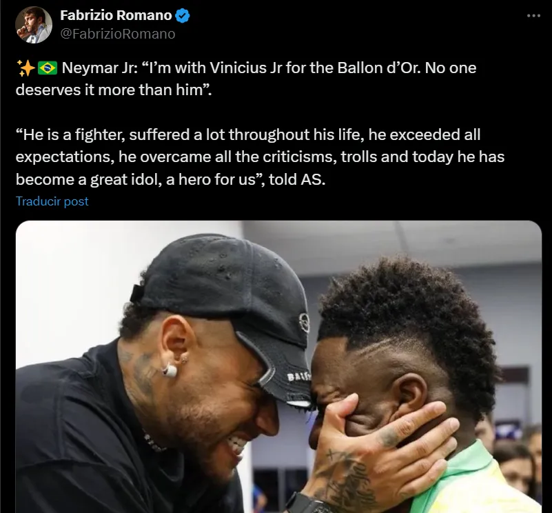 Sin rodeos, Neymar decantó por Vinicius Jr para ganar este BdO y explico los motivos de manera contundente. En diálogo con AS, el extremo de Al-Hilal soltó: “Estoy con Vinicius Jr para el Balón de Oro. Nadie lo merece más que él. Es un luchador, sufrió mucho a lo largo de su vida, superó todas las expectativas, superó todas las críticas, los trolls y hoy se ha convertido en un gran ídolo. Es un héroe para nosotros“.
