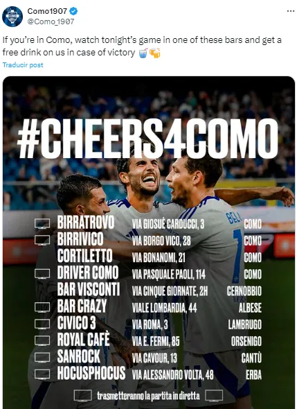 En la previa del encuentro, Como 1907 anunció en sus redes sociales que los hinchas que vieran el partido en determinados bares se ganarían una bebida gratis en caso de victoria del equipo. De esta manera, esta noche estarán agradecidos al gran duelo de Nico Paz.