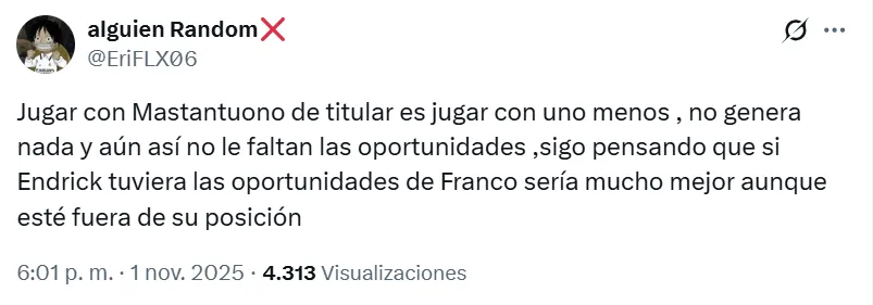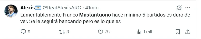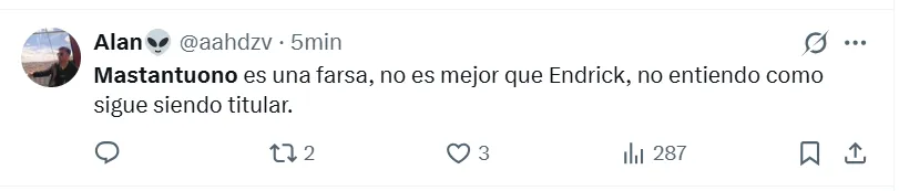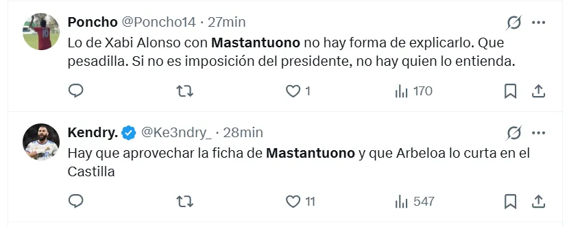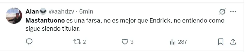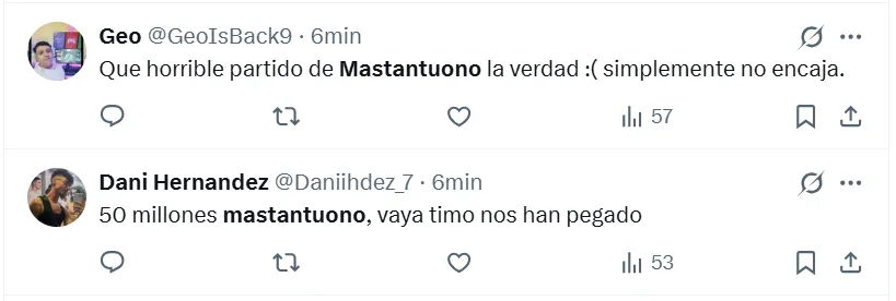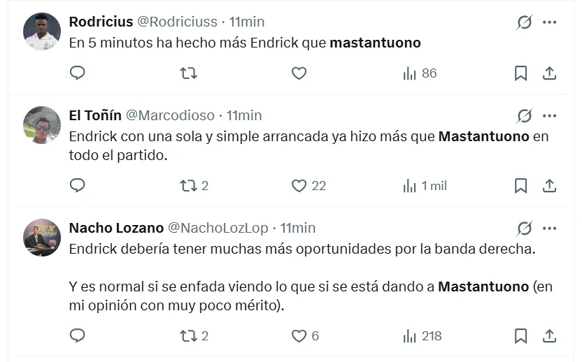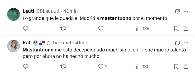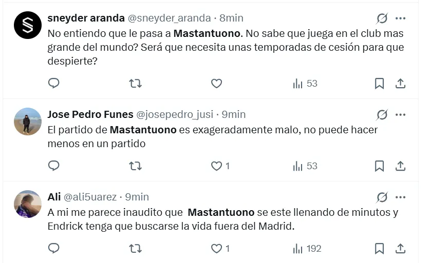 Otros posteos muy similares de los simpatizantes del conjunto español, fueron: “No genera nada y aún así no le faltan oportunidades”, “el fraude que está siendo”, “es exageradamente malo”, “simplemente no encaja”, “vaya timo”, “sigue muy verde”, “está para bajarlo al Castilla”, “es una farsa”, “no entiendo como sigue siendo titular” y “la pierde y se tira”.