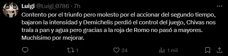 Luego del triunfo ante Chivas, a Demichelis le consultaron en conferencia de prensa por el incidente con Sergio Canales y el DT afirmó: “Fue una semana con un incidente importante para lo externo. No pasó nada que no sea normal dentro de un grupo competitivo, de una institución grande. Por la exigencia de ser protagonistas, con jugadores de jerarquía”.