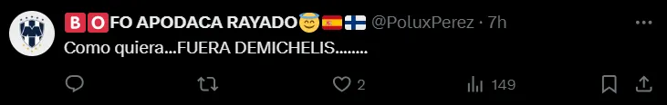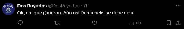 Así y todo, los hinchas fueron lapidario con el ex DT de River en las redes sociales y piden su renuncia. Cabe destacar que, Rayados tiene un partido clave por delante: el próximo sábado visitará a Tigres en el clásico de Monterrey y el resultado puede ser clave para el futuro del entrenador y también para el equipo ya que actualmente se encuentra a cuatro puntos de Tigres con seis en juego de la temporada regular.